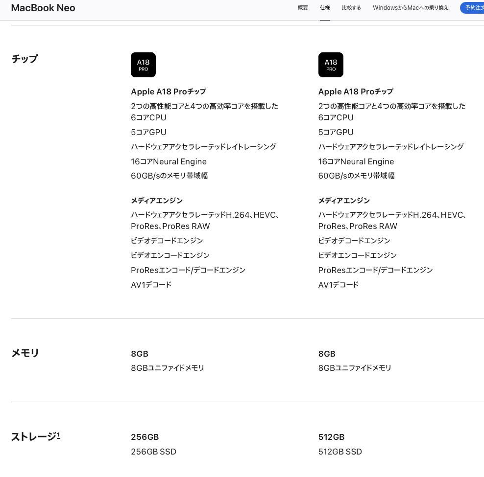 今回のMacBook Neoはエントリーモデル(入門機)という位置付けというのがスペックをみて感じた点となります。